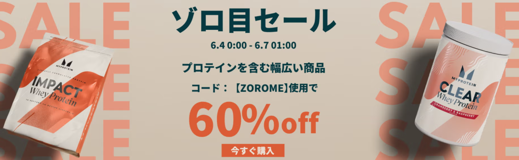 このセールでは、プロテイン類は50〜51%OFF、『Impact ホエイ EAA』は64〜67%OFFで購入できるというもの。